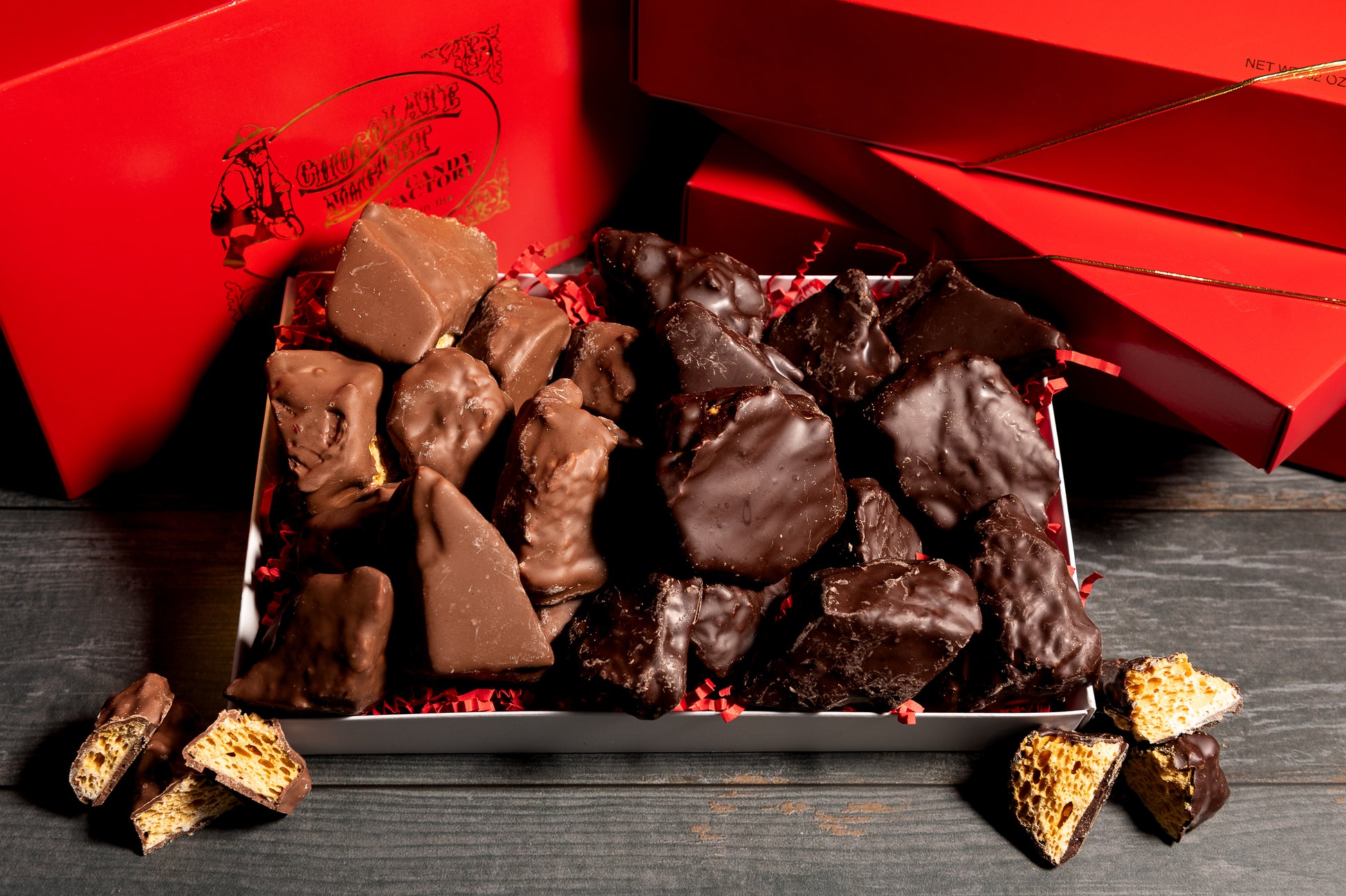 Made with pure honey, enjoy a light crunchy brown sugar sponge. Also known as “honeycomb” in some areas. One pound of milk chocolate and dark chocolate sponge in a beautiful gift box.