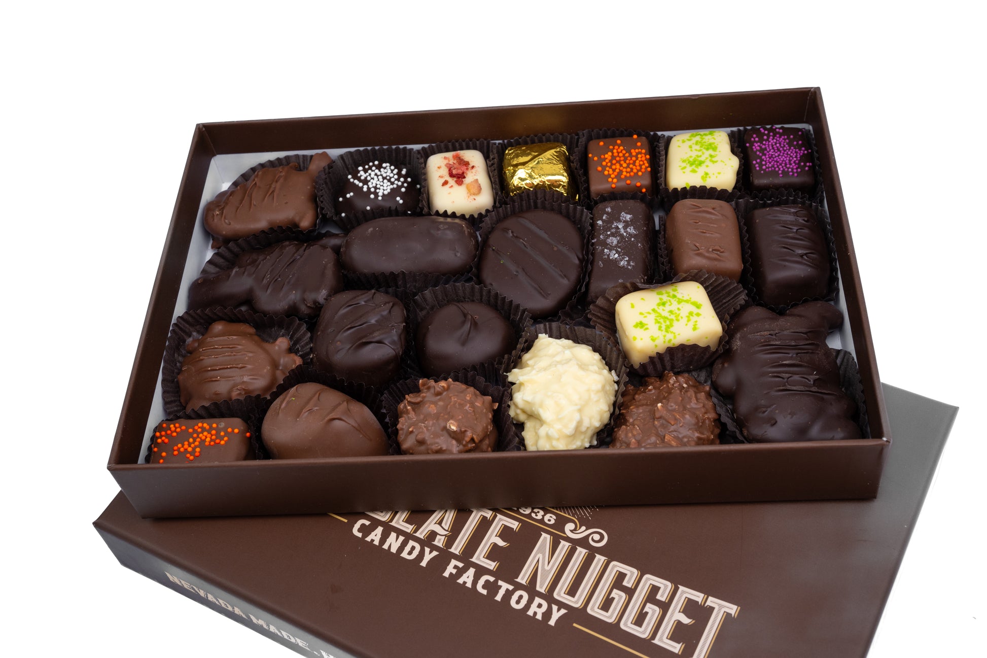 The best of the best! This is our assorted 2 lb gift box of chocolates ALL hand crafted by 3rd generation candy makers. Everything from our homemade caramels, pecan patties, meltaways, and nut clusters. Using only the freshest of ingredients such as fresh dairy cream, butter, the finest pure chocolate, fresh nutmeats and with no preservatives or additives. Approximately 46 pieces.